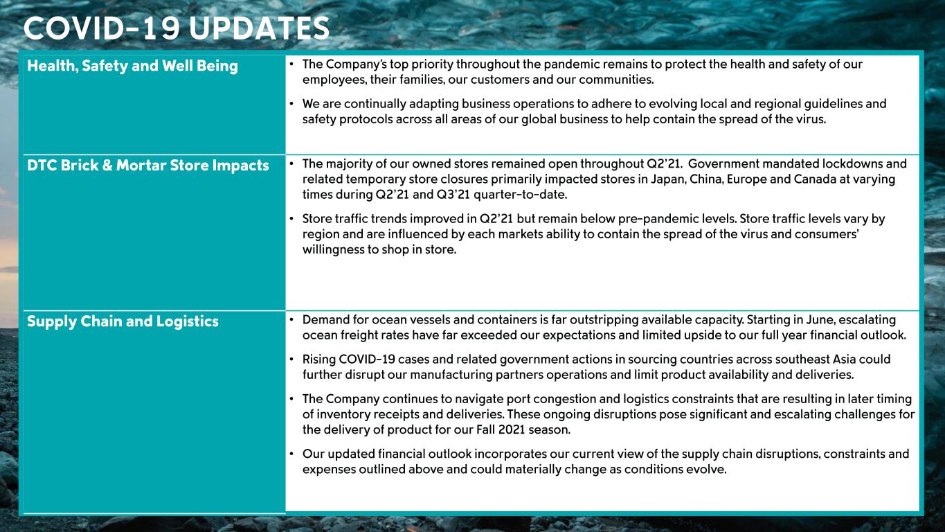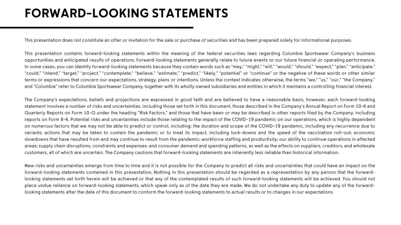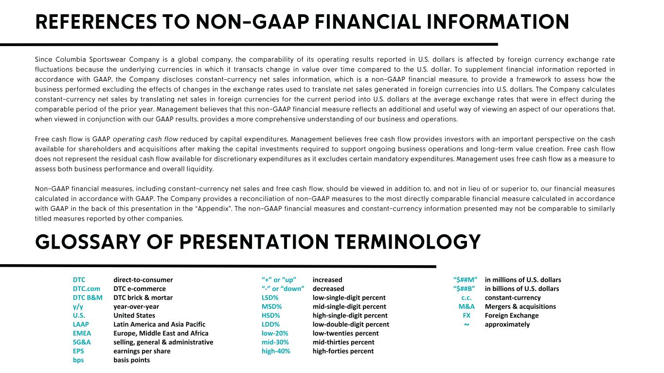 DTC DTC.com DTC B&M y/y U.S. LAAP EMEA SG&A EPS bps direct-to-consumer DTC e-commerce DTC brick & mortar year-over-year United States Latin America and Asia Pacific Europe, Middle East and Africa selling, general & administrative earnings per share basis points “+” or “up” “-” or “down” LSD% MSD% HSD% LDD% low-20% mid-30% high-40% increased decreased low-single-digit percent mid-single-digit percent high-single-digit percent low-double-digit percent low-twenties percent mid-thirties percent high-forties percent “$##M” “$##B” c.c. M&A FX ~ in millions of U.S. dollars in billions of U.S. dollars constant-currency Mergers & acquisitions Foreign Exchange approximately