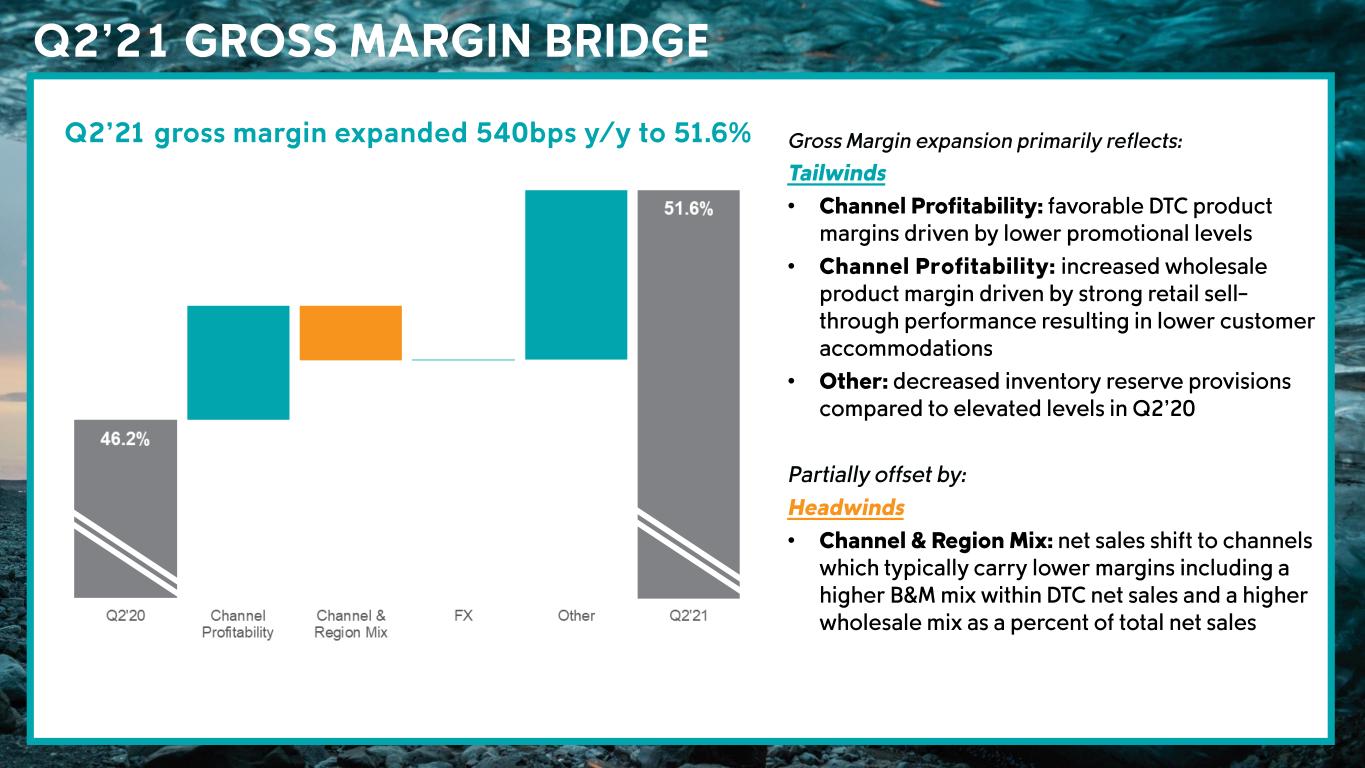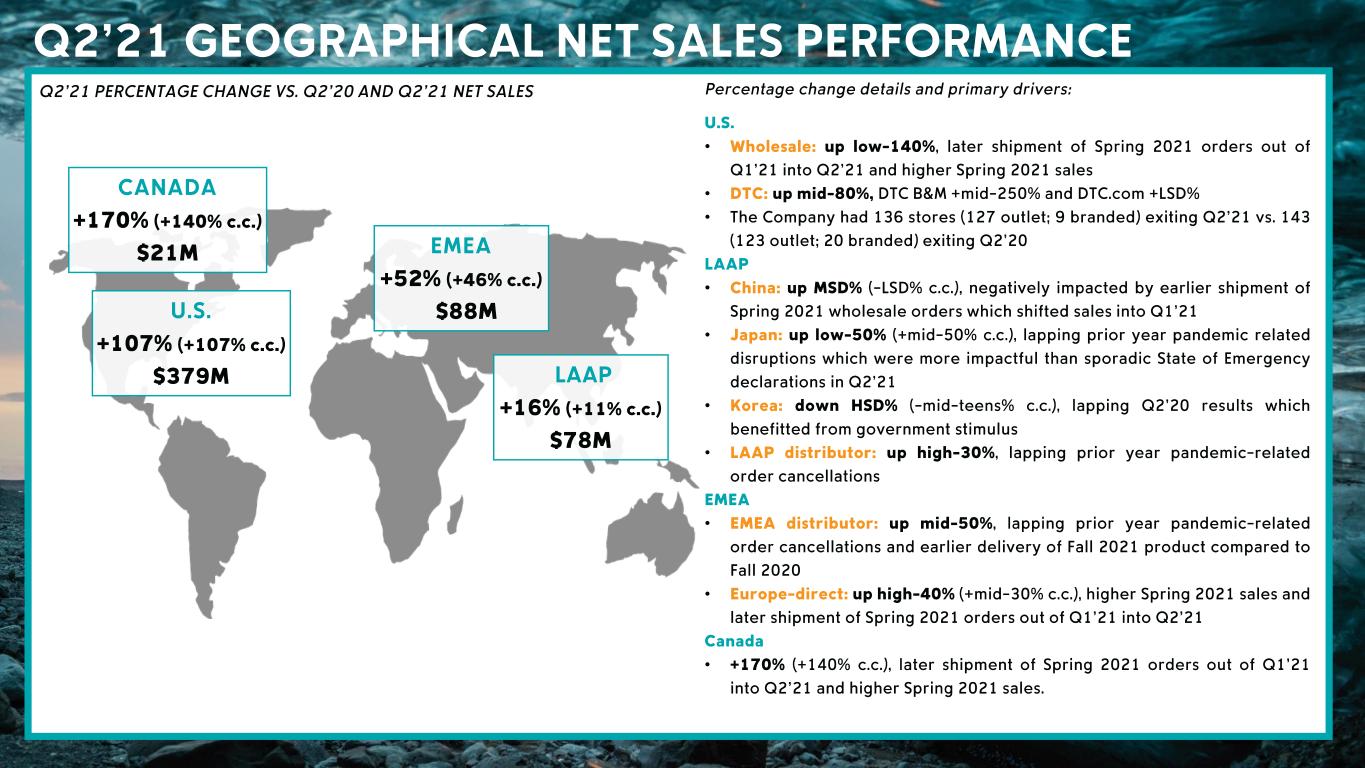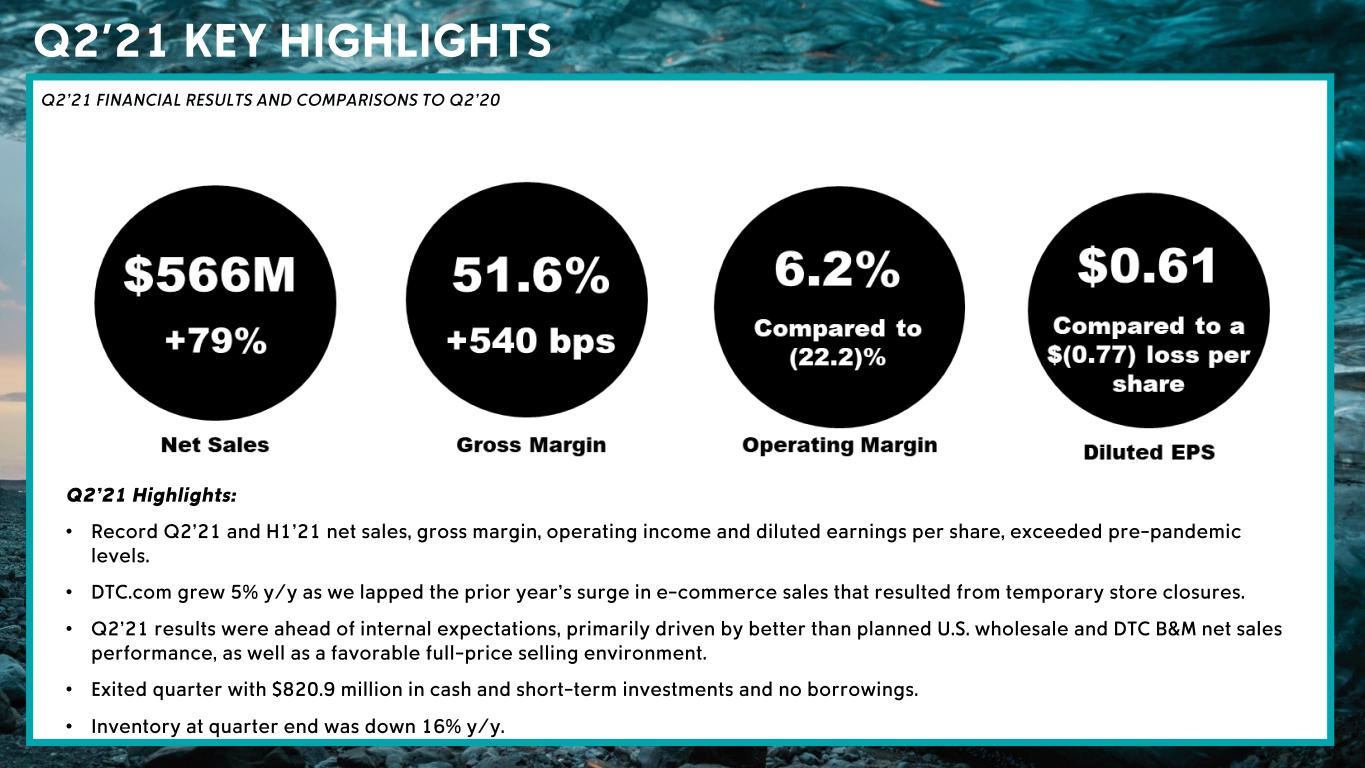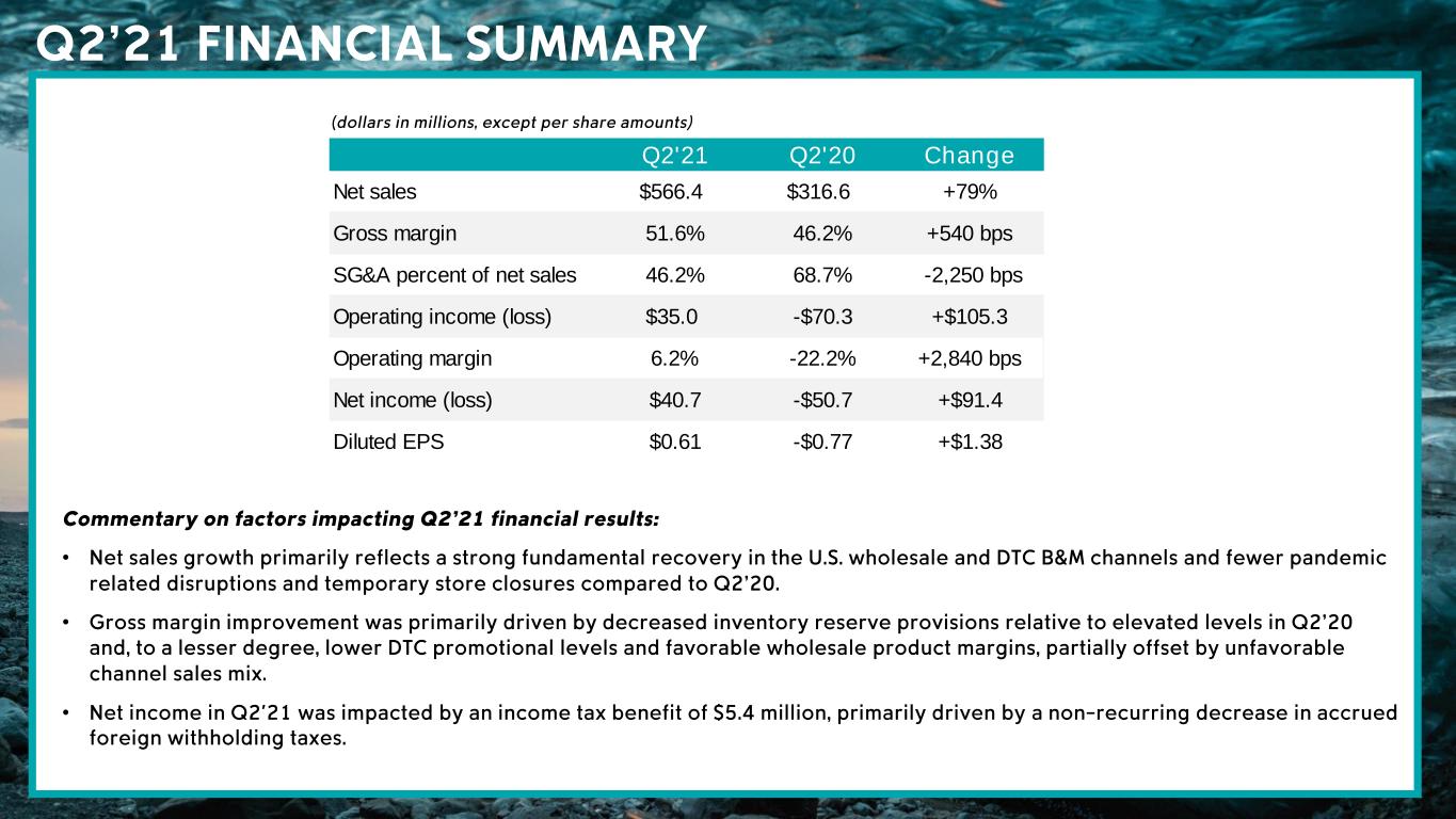 • • • Q2'21 Q2'20 Change Net sales $566.4 $316.6 +79% Gross margin 51.6% 46.2% +540 bps SG&A percent of net sales 46.2% 68.7% -2,250 bps Operating income (loss) $35.0 -$70.3 +$105.3 Operating margin 6.2% -22.2% +2,840 bps Net income (loss) $40.7 -$50.7 +$91.4 Diluted EPS $0.61 -$0.77 +$1.38