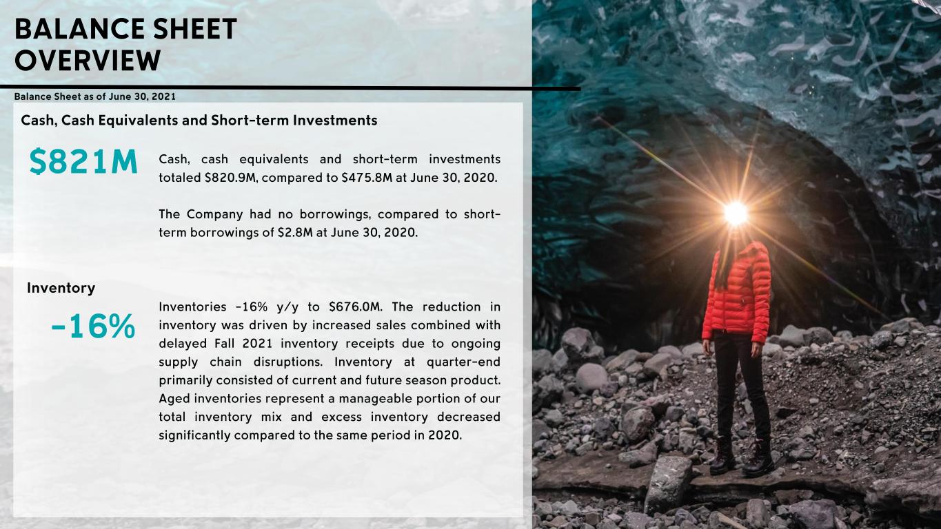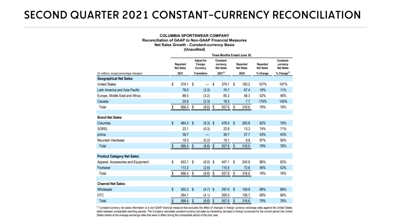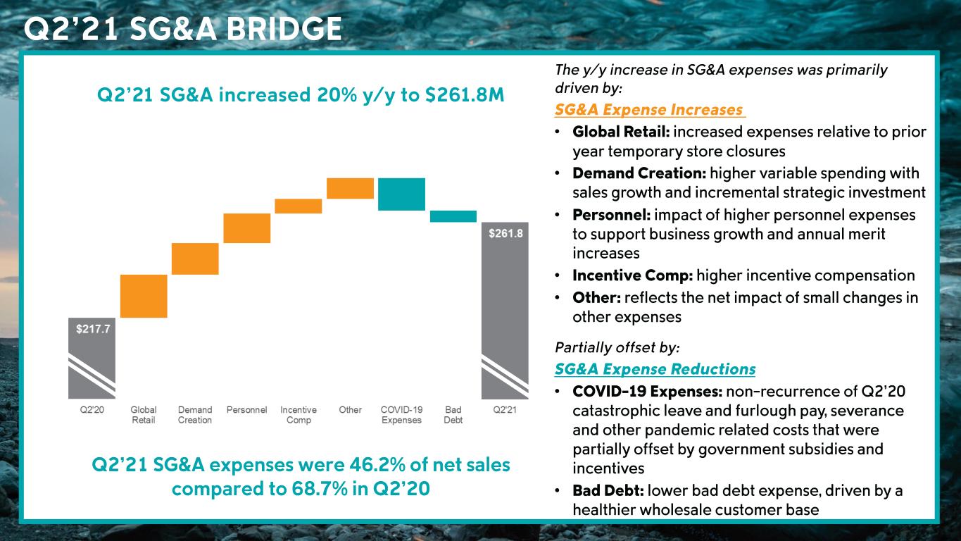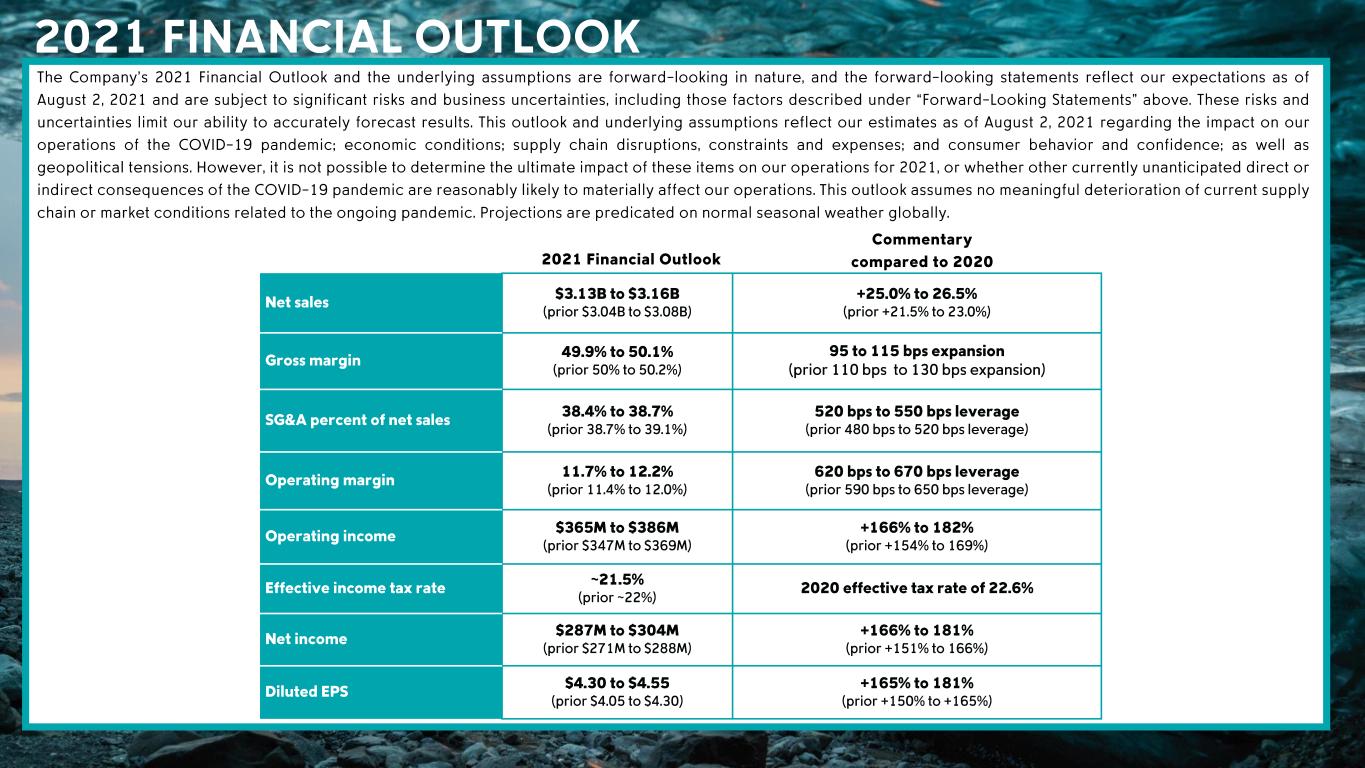 • • • Q2'21 Q2'20 Change Net sales $566.4 $316.6 +79% Gross margin 51.6% 46.2% +540 bps SG&A percent of net sales 46.2% 68.7% -2,250 bps Operating income (loss) $35.0 -$70.3 +$105.3 Operating margin 6.2% -22.2% +2,840 bps Net income (loss) $40.7 -$50.7 +$91.4 Diluted EPS $0.61 -$0.77 +$1.38