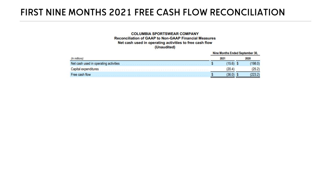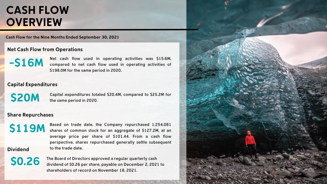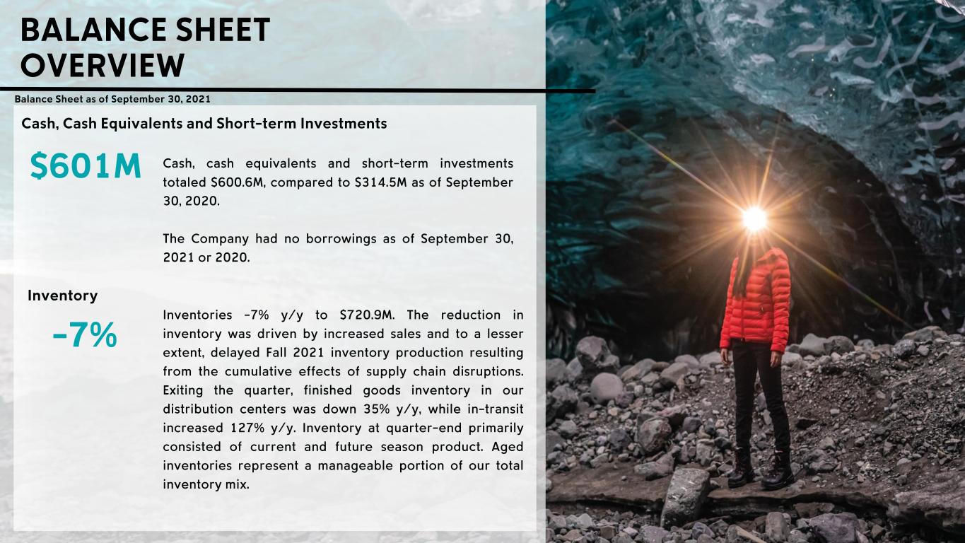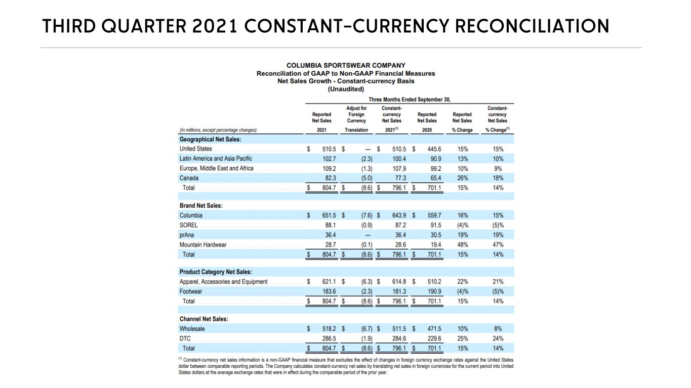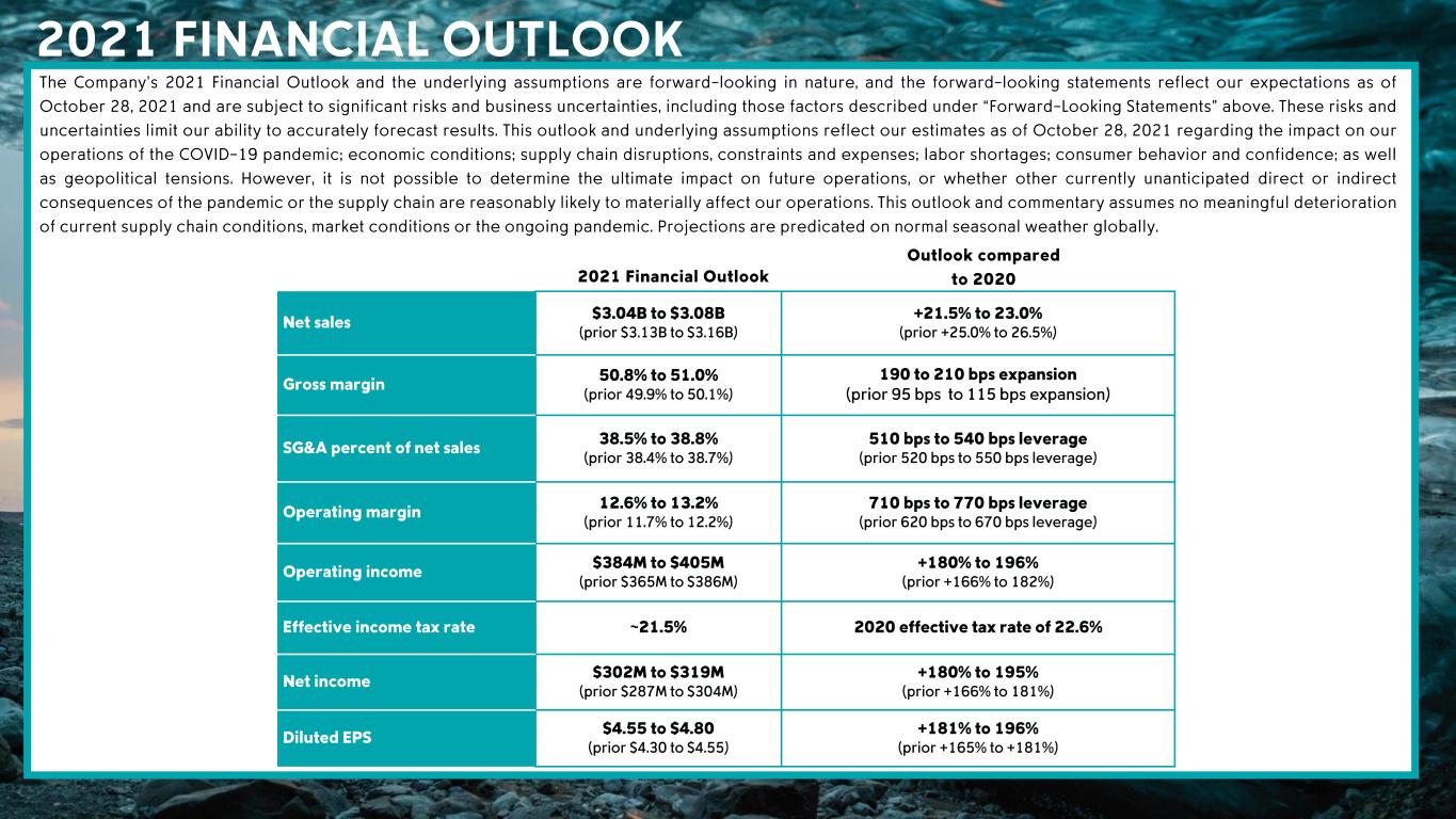 • • • Q3'21 Q3'20 Change Net sales $804.7 $701.1 +15% Gross margin 50.7% 48.9% +180 bps SG&A percent of net sales 34.8% 37.3% -250 bps Operating income $133.5 $85.6 +56% Operating margin 16.6% 12.2% +440 bps Net income $100.6 $62.8 +60% Diluted EPS $1.52 $0.94 +62% (dollars in millions, except per share amounts)