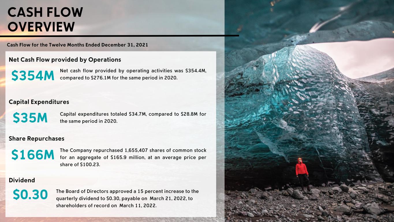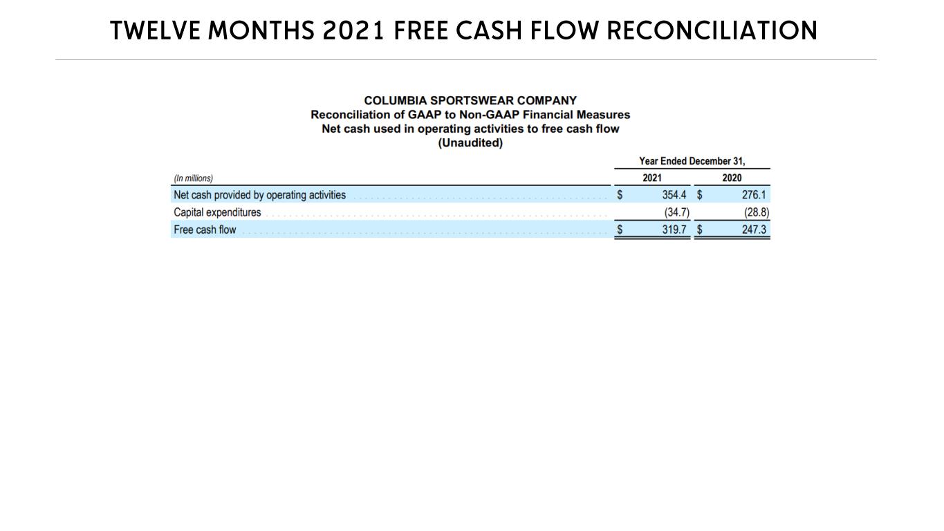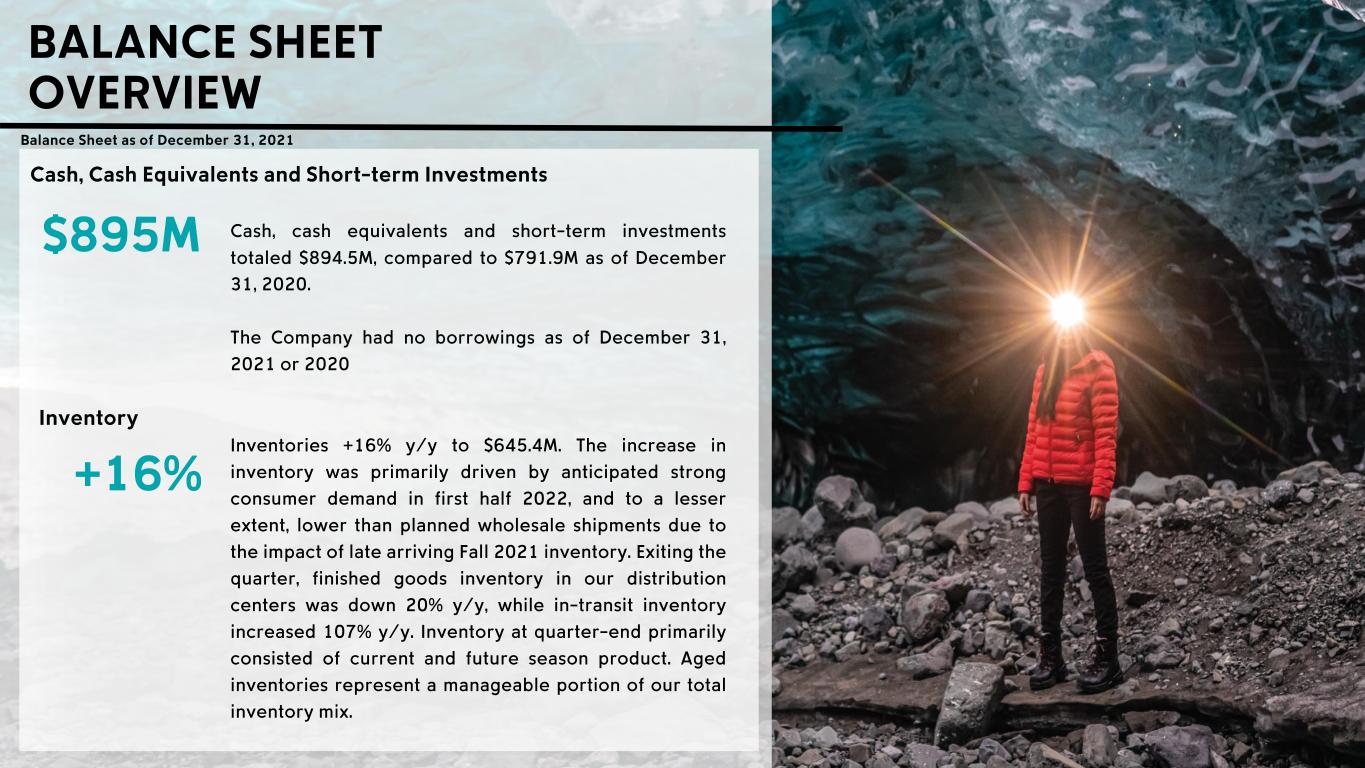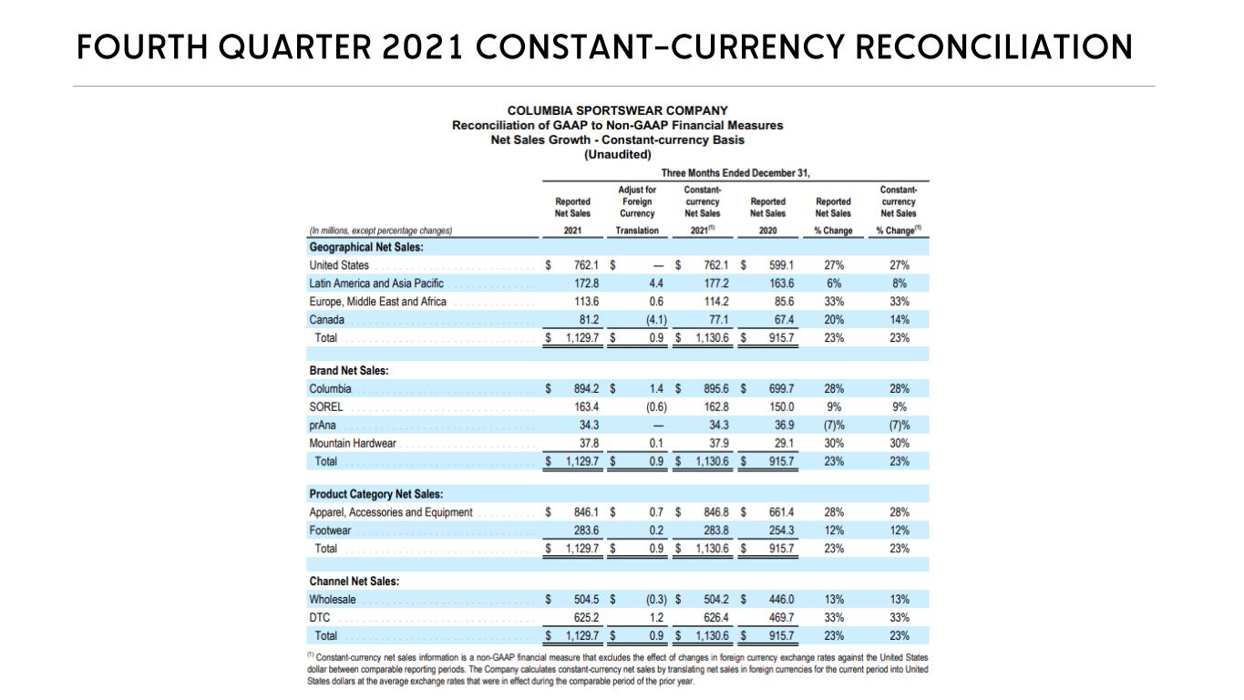 • • • (dollars in millions, except per share amounts) Q4'21 Q4'20 Change Net sales $1,129.7 $915.6 +23% Gross margin 52.2% 50.6% +160 bps SG&A percent of net sales 34.0% 37.5% -350 bps Operating income $211.6 $123.7 +71% Operating margin 18.7% 13.5% +520 bps Net income $157.0 $95.8 +64% Diluted EPS $2.39 $1.44 +66%
