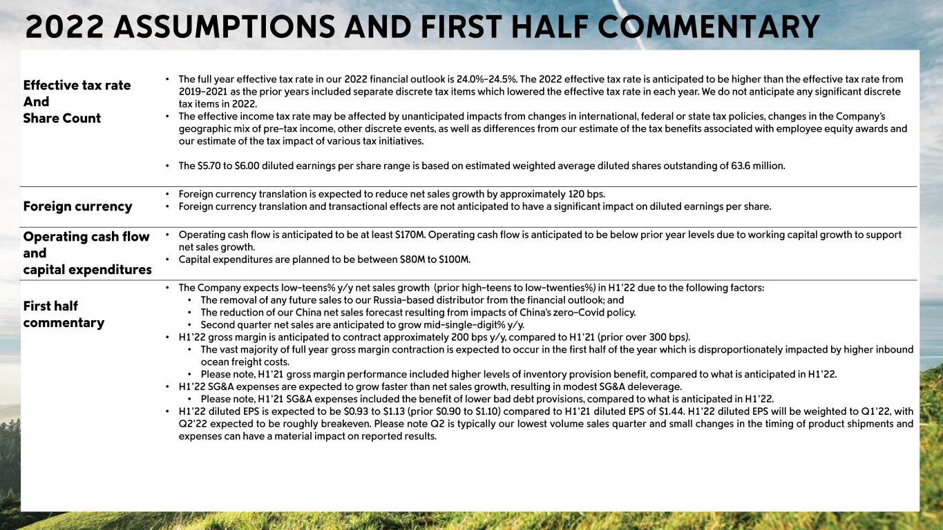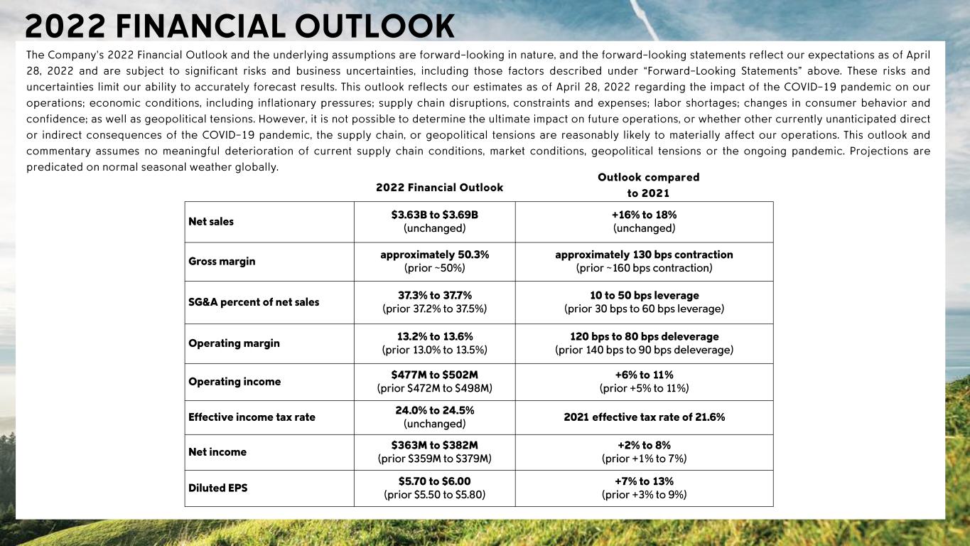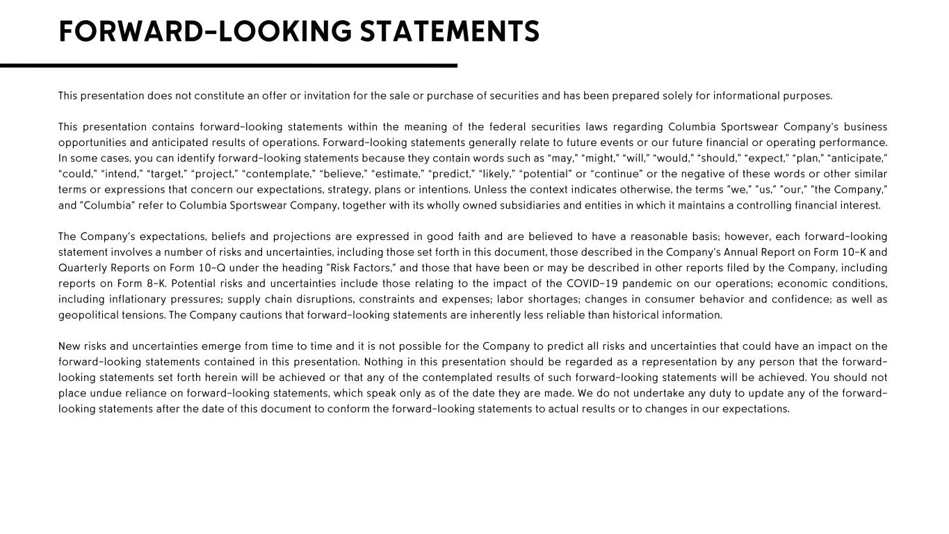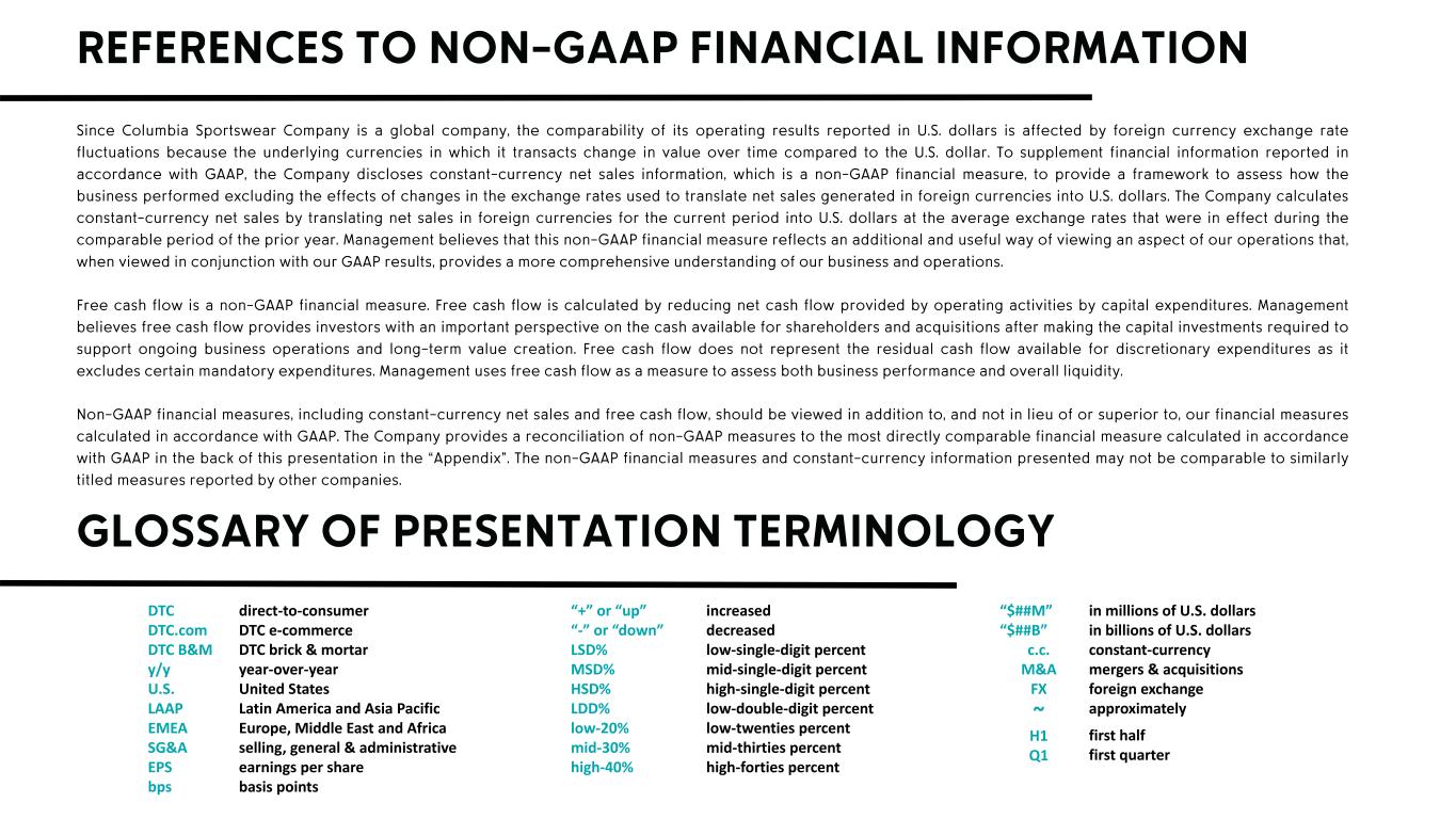 DTC DTC.com DTC B&M y/y U.S. LAAP EMEA SG&A EPS bps direct-to-consumer DTC e-commerce DTC brick & mortar year-over-year United States Latin America and Asia Pacific Europe, Middle East and Africa selling, general & administrative earnings per share basis points “+” or “up” “-” or “down” LSD% MSD% HSD% LDD% low-20% mid-30% high-40% increased decreased low-single-digit percent mid-single-digit percent high-single-digit percent low-double-digit percent low-twenties percent mid-thirties percent high-forties percent “$##M” “$##B” c.c. M&A FX ~ H1 Q1 in millions of U.S. dollars in billions of U.S. dollars constant-currency mergers & acquisitions foreign exchange approximately first half first quarter