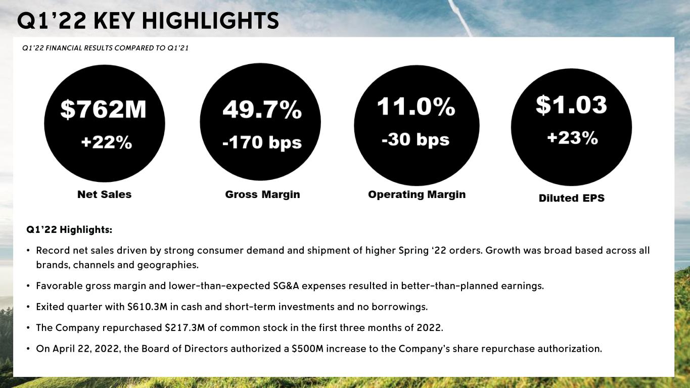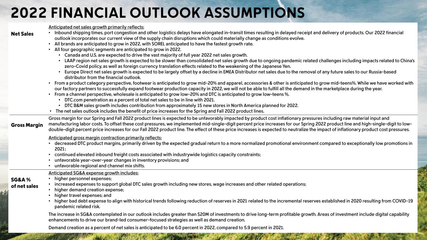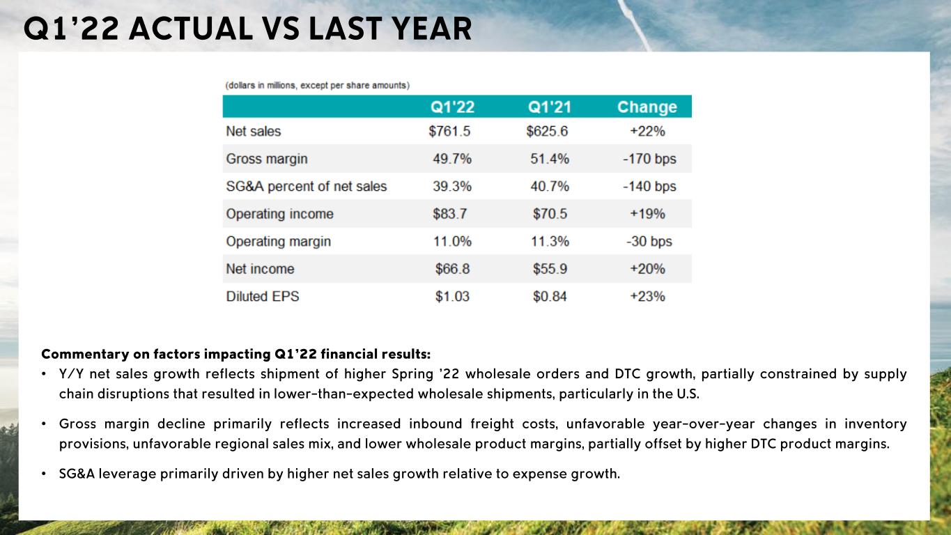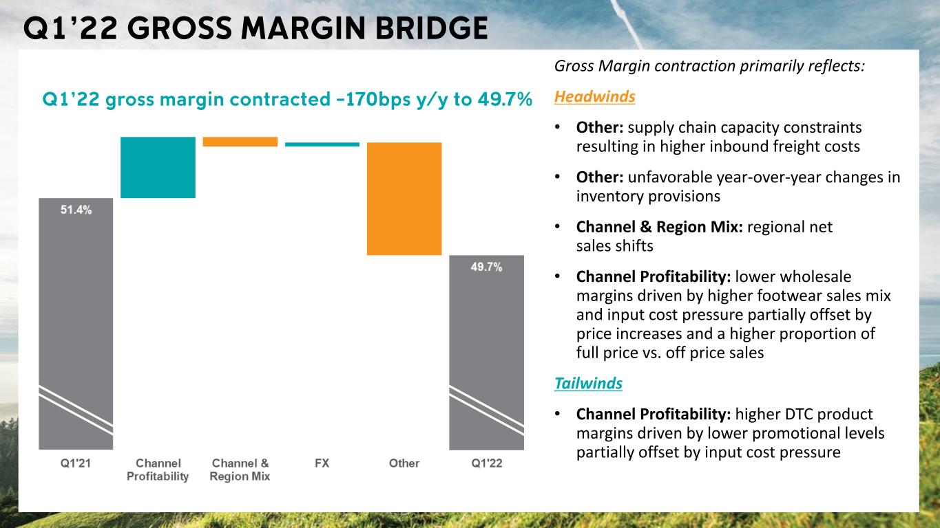 Gross Margin contraction primarily reflects: Headwinds • Other: supply chain capacity constraints resulting in higher inbound freight costs • Other: unfavorable year-over-year changes in inventory provisions • Channel & Region Mix: regional net sales shifts • Channel Profitability: lower wholesale margins driven by higher footwear sales mix and input cost pressure partially offset by price increases and a higher proportion of full price vs. off price sales Tailwinds • Channel Profitability: higher DTC product margins driven by lower promotional levels partially offset by input cost pressure