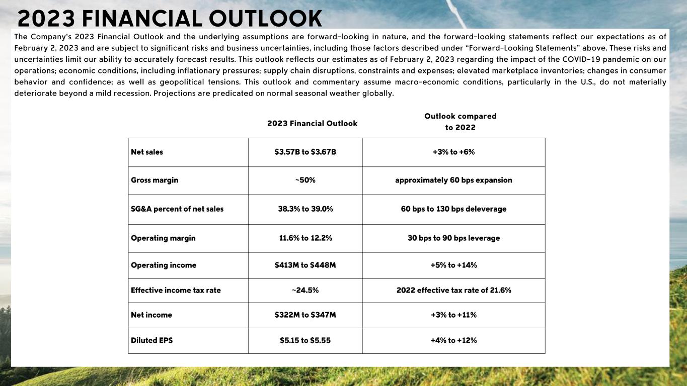 • • • • • Q4'22 Q4'21 Change Net Sales $1,169.6 $1,129.7 +4% Gross margin 50.4% 52.2% -180 bps SG&A percent of net sales 34.6% 34.0% +60 bps Operating income $155.4 $211.6 -27% Operating margin 13.3% 18.7% -540 bps Net income $125.7 $157.0 -20% Diluted EPS $2.02 $2.39 -15%