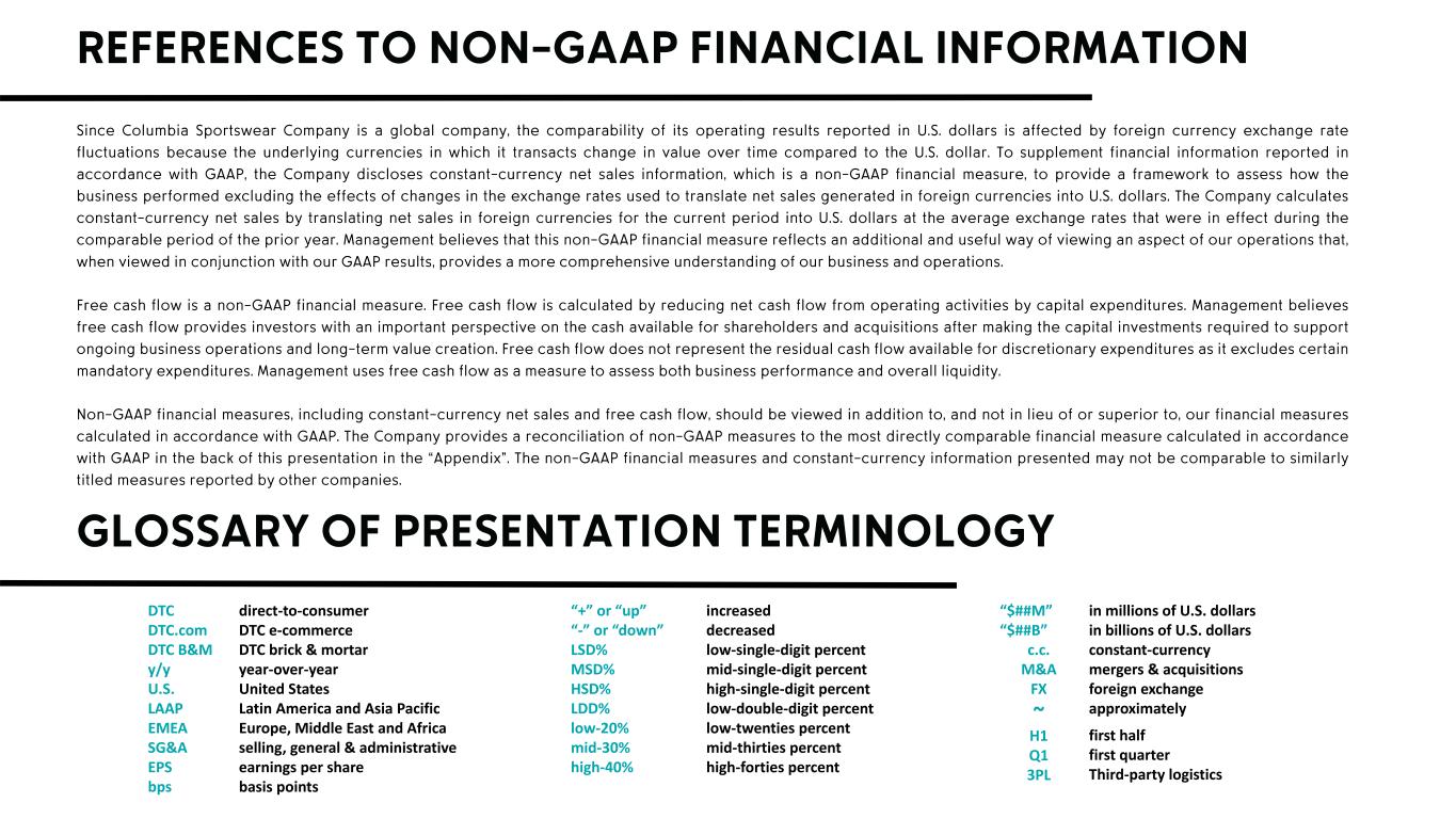 DTC DTC.com DTC B&M y/y U.S. LAAP EMEA SG&A EPS bps direct-to-consumer DTC e-commerce DTC brick & mortar year-over-year United States Latin America and Asia Pacific Europe, Middle East and Africa selling, general & administrative earnings per share basis points “+” or “up” “-” or “down” LSD% MSD% HSD% LDD% low-20% mid-30% high-40% increased decreased low-single-digit percent mid-single-digit percent high-single-digit percent low-double-digit percent low-twenties percent mid-thirties percent high-forties percent “$##M” “$##B” c.c. M&A FX ~ H1 Q1 3PL in millions of U.S. dollars in billions of U.S. dollars constant-currency mergers & acquisitions foreign exchange approximately first half first quarter Third-party logistics