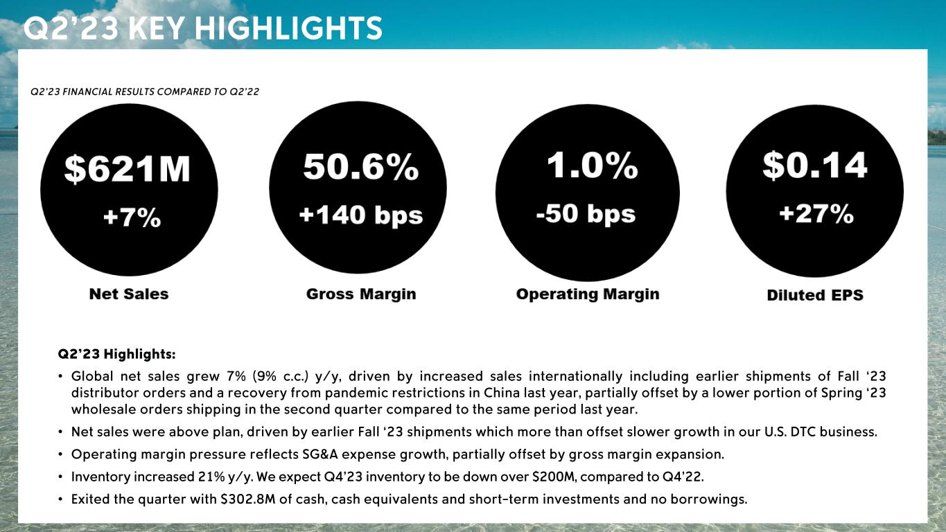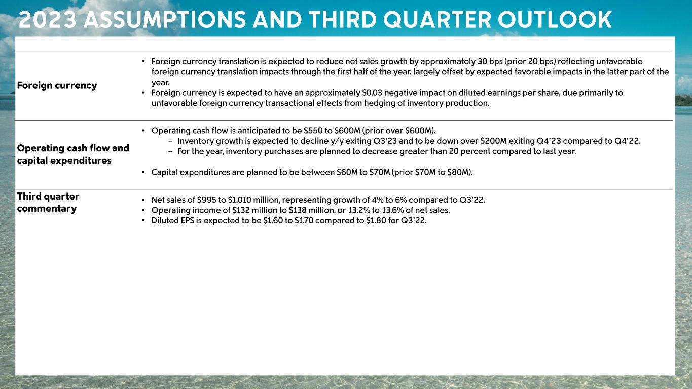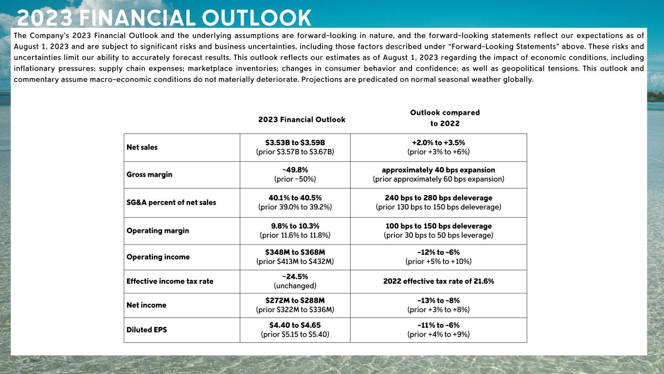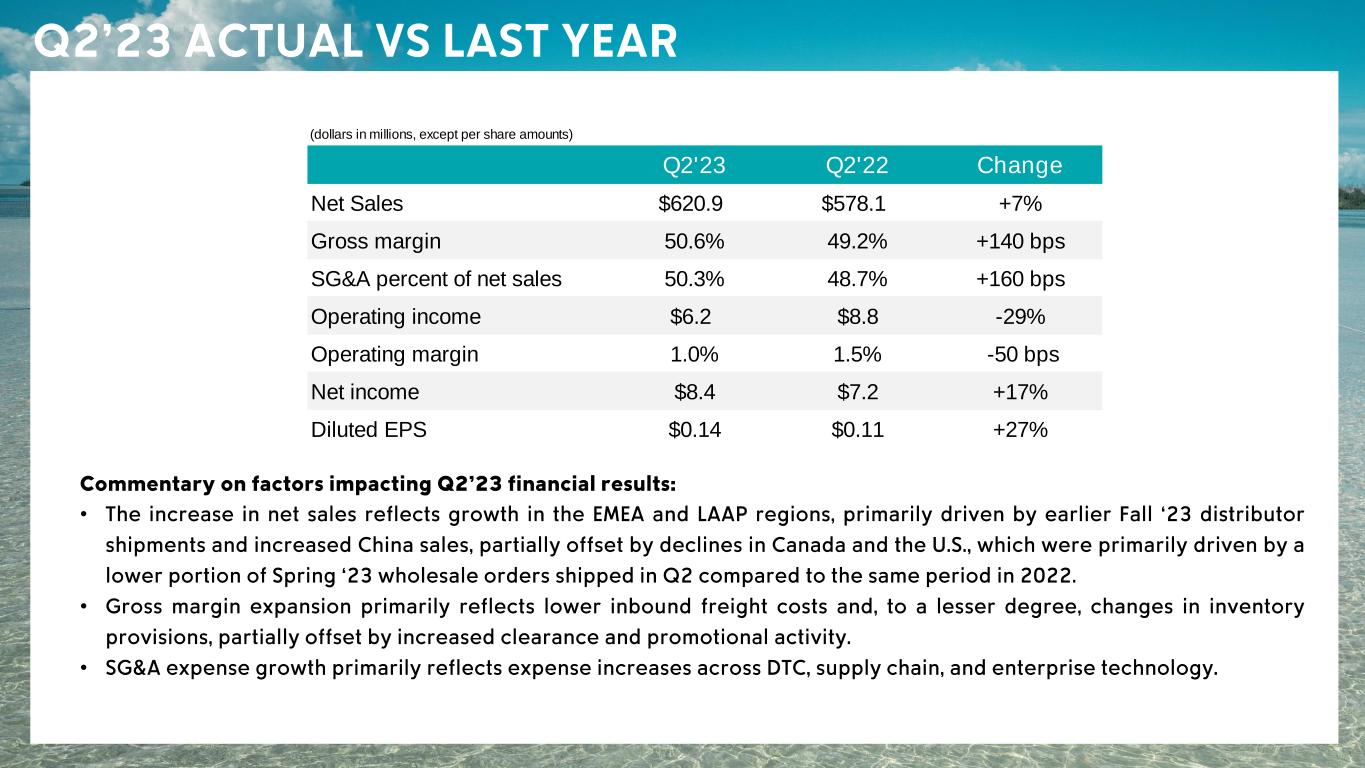 • • • (dollars in millions, except per share amounts) Q2'23 Q2'22 Change Net Sales $620.9 $578.1 +7% Gross margin 50.6% 49.2% +140 bps SG&A percent of net sales 50.3% 48.7% +160 bps Operating income $6.2 $8.8 -29% Operating margin 1.0% 1.5% -50 bps Net income $8.4 $7.2 +17% Diluted EPS $0.14 $0.11 +27%
