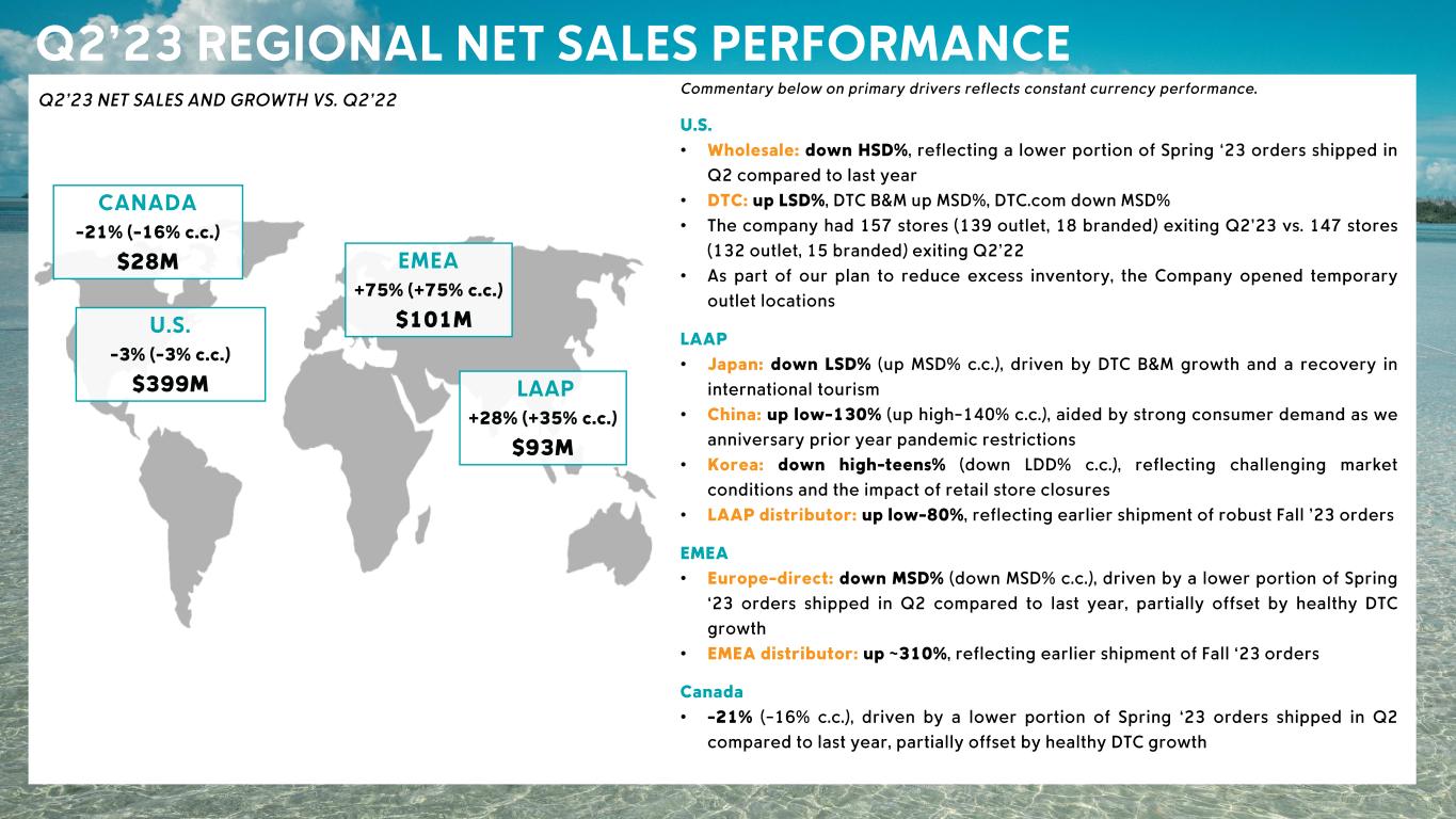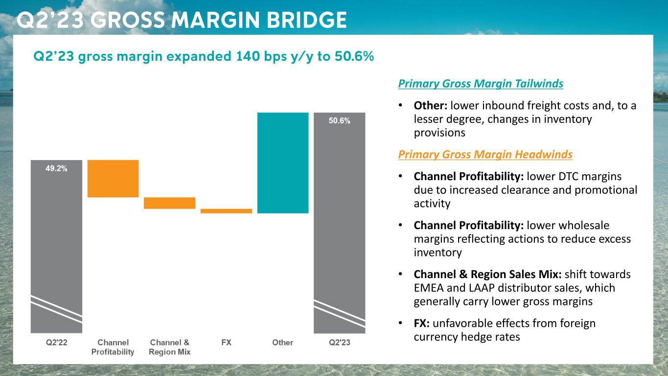Primary Gross Margin Tailwinds • Other: lower inbound freight costs and, to a lesser degree, changes in inventory provisions Primary Gross Margin Headwinds • Channel Profitability: lower DTC margins due to increased clearance and promotional activity • Channel Profitability: lower wholesale margins reflecting actions to reduce excess inventory • Channel & Region Sales Mix: shift towards EMEA and LAAP distributor sales, which generally carry lower gross margins • FX: unfavorable effects from foreign currency hedge rates