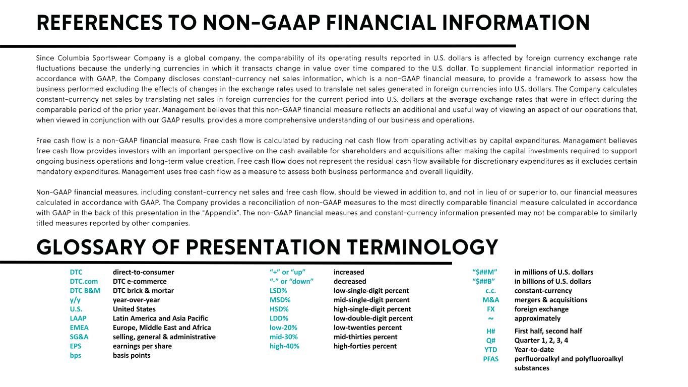 DTC DTC.com DTC B&M y/y U.S. LAAP EMEA SG&A EPS bps direct-to-consumer DTC e-commerce DTC brick & mortar year-over-year United States Latin America and Asia Pacific Europe, Middle East and Africa selling, general & administrative earnings per share basis points “+” or “up” “-” or “down” LSD% MSD% HSD% LDD% low-20% mid-30% high-40% increased decreased low-single-digit percent mid-single-digit percent high-single-digit percent low-double-digit percent low-twenties percent mid-thirties percent high-forties percent “$##M” “$##B” c.c. M&A FX ~ H# Q# YTD PFAS in millions of U.S. dollars in billions of U.S. dollars constant-currency mergers & acquisitions foreign exchange approximately First half, second half Quarter 1, 2, 3, 4 Year-to-date perfluoroalkyl and polyfluoroalkyl substances