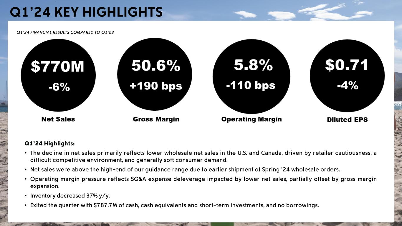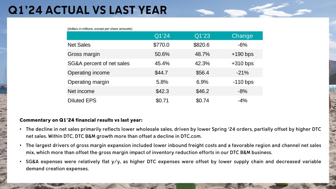 • • • (dollars in millions, except per share amounts) Q1'24 Q1'23 Change Net Sales $770.0 $820.6 -6% Gross margin 50.6% 48.7% +190 bps SG&A percent of net sales 45.4% 42.3% +310 bps Operating income $44.7 $56.4 -21% Operating margin 5.8% 6.9% -110 bps Net income $42.3 $46.2 -8% Diluted EPS $0.71 $0.74 -4%