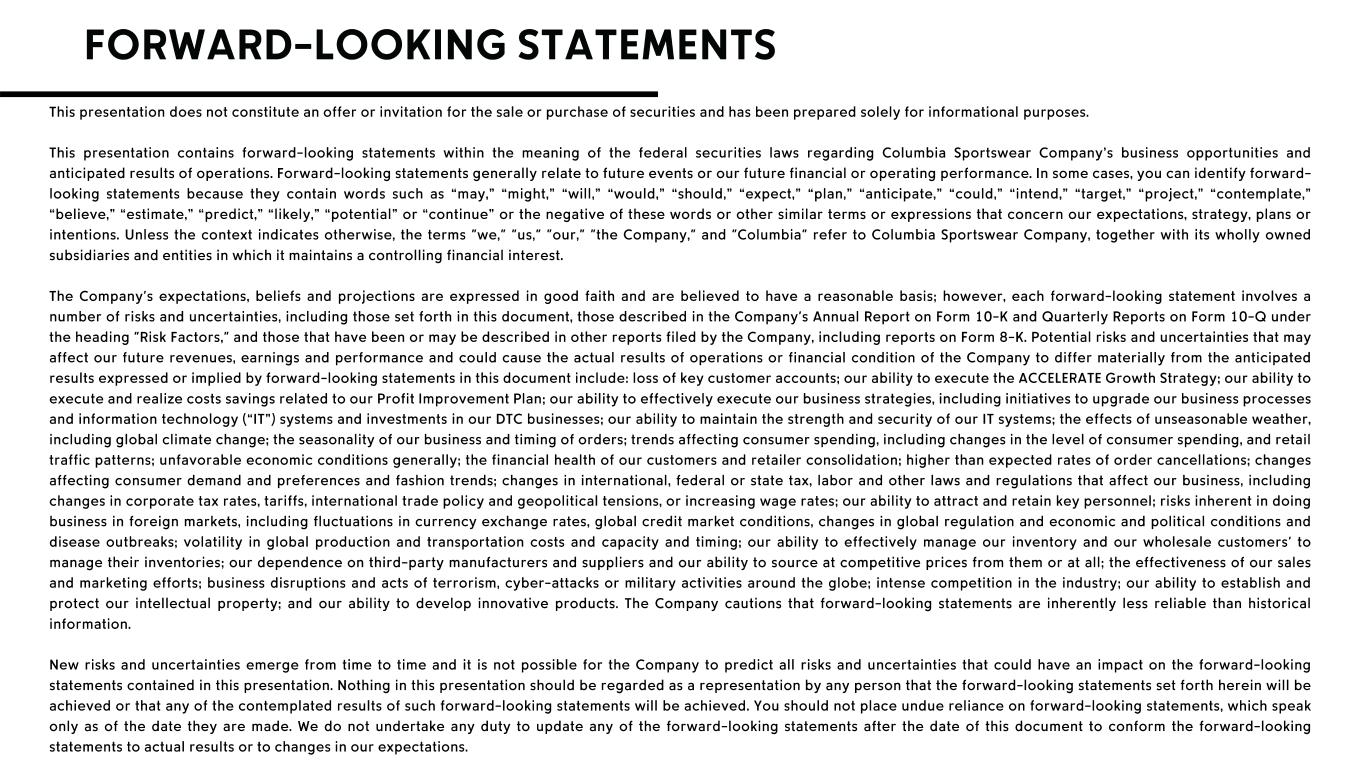 DTC DTC.com DTC B&M y/y U.S. LAAP EMEA SG&A EPS bps direct-to-consumer DTC e-commerce DTC brick & mortar year-over-year United States Latin America and Asia Pacific Europe, Middle East and Africa selling, general & administrative earnings per share basis points “+” or “up” “-” or “down” LSD% MSD% HSD% LDD% low-20% mid-30% high-40% increased decreased low-single-digit percent mid-single-digit percent high-single-digit percent low-double-digit percent low-twenties percent mid-thirties percent high-forties percent “$##M” “$##B” c.c. M&A FX ~ H# Q# YTD in millions of U.S. dollars in billions of U.S. dollars constant-currency mergers & acquisitions foreign exchange approximately First half, second half Quarter 1, 2, 3, 4 Year-to-date