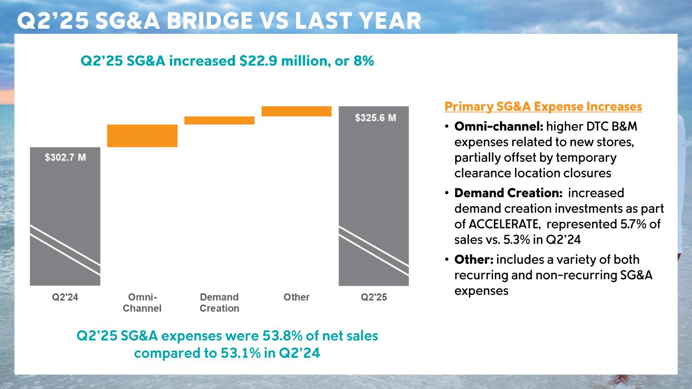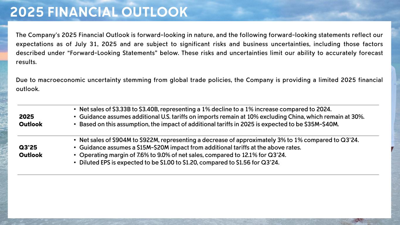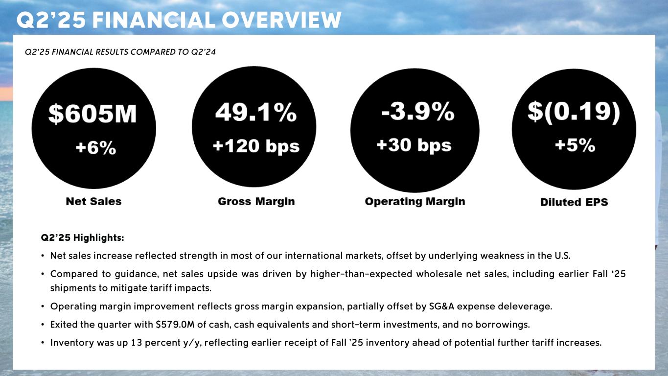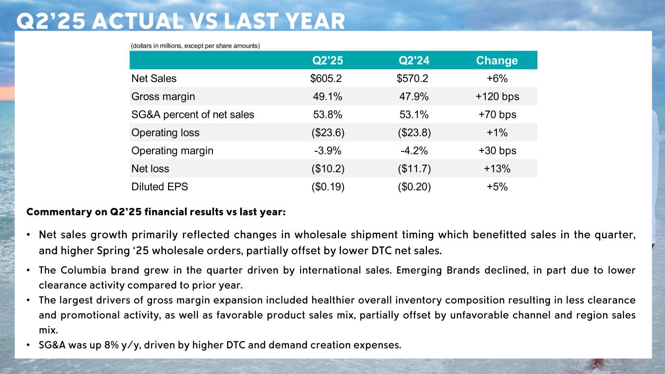 • • • • (dollars in millions, except per share amounts) Q2'25 Q2'24 Change Net Sales $605.2 $570.2 +6% Gross margin 49.1% 47.9% +120 bps SG&A percent of net sales 53.8% 53.1% +70 bps Operating loss ($23.6) ($23.8) +1% Operating margin -3.9% -4.2% +30 bps Net loss ($10.2) ($11.7) +13% Diluted EPS ($0.19) ($0.20) +5%