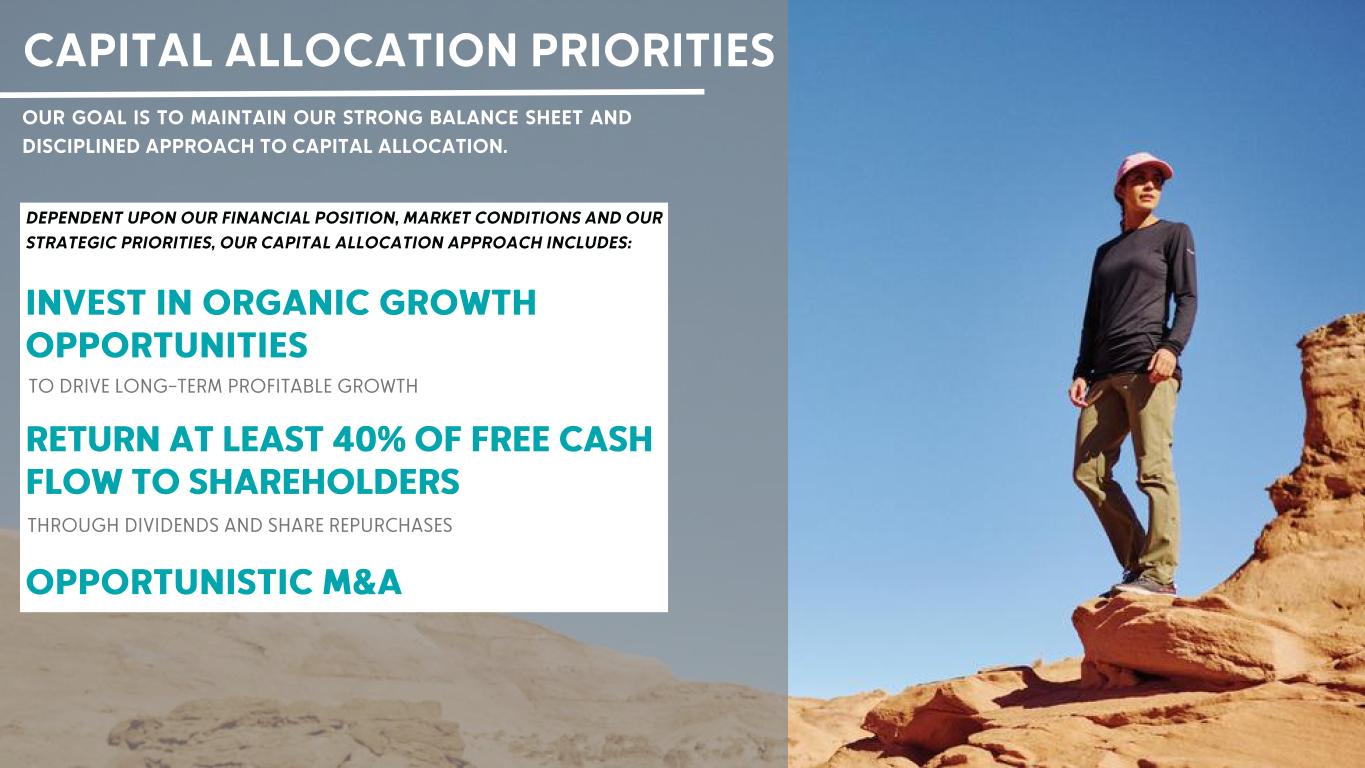 CAPITAL ALLOCATION PRIORITIES DEPENDENT UPON OUR FINANCIAL POSITION, MARKET CONDITIONS AND OUR STRATEGIC PRIORITIES, OUR CAPITAL ALLOCATION APPROACH INCLUDES: INVEST IN ORGANIC GROWTH OPPORTUNITIES RETURN AT LEAST 40% OF FREE CASH FLOW TO SHAREHOLDERS OPPORTUNISTIC M&A TO DRIVE LONG - TERM PROFITABLE GROWTH THROUGH DIVIDENDS AND SHARE REPURCHASES OUR GOAL IS TO MAINTAIN OUR STRONG BALANCE SHEET AND DISCIPLINED APPROACH TO CAPITAL ALLOCATION .