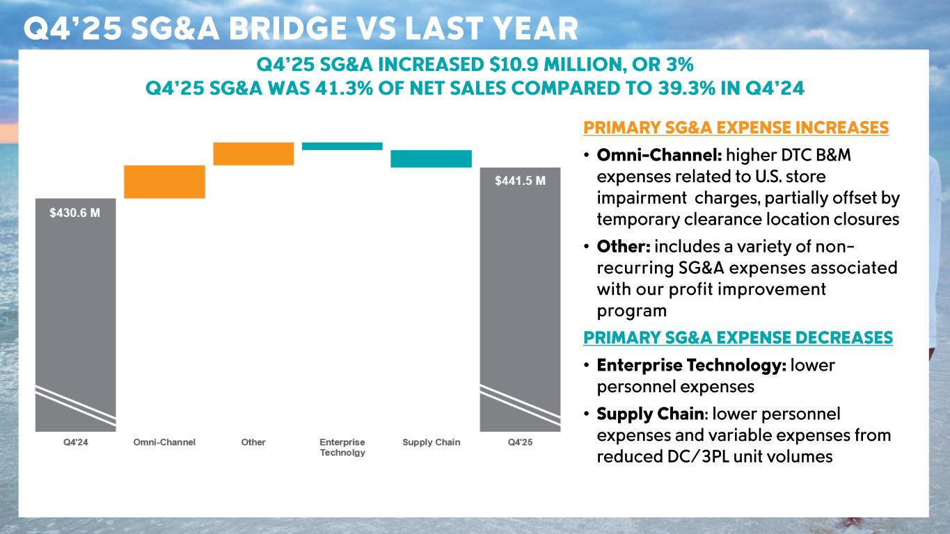 CSC Confidential – Sensitive Information Q4’25 ACTUAL VS LAST YEAR Commentary on Q 4 ’25 financial results vs last year : • Net sales decrease primarily reflected earlier shipment of Fall ‘25 wholesale orders, partially offset by a modest increase in DTC net sales . • Gross margin expansion driven by healthier inventory composition resulting in less clearance and promotional activity, as well as lower inventory loss provisions, partially offset by the impact of incremental U.S. tariffs . • SG&A was up 3% y/y, primarily driven by higher DTC expenses and other non - recurring SG&A expenses associated with our profit improvement program, partially offset by lower enterprise technology and supply chain expenses, largely resulting from our profit improvement program .